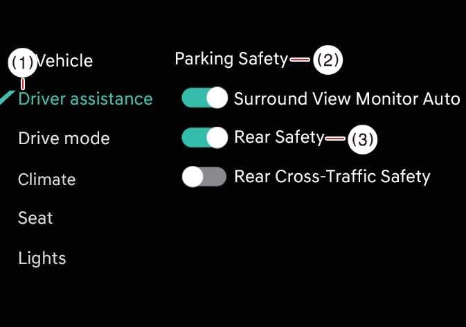 When you restart your vehicle, Backward Safety is selected and Parking Collision-Avoidance Assist settings are retained.