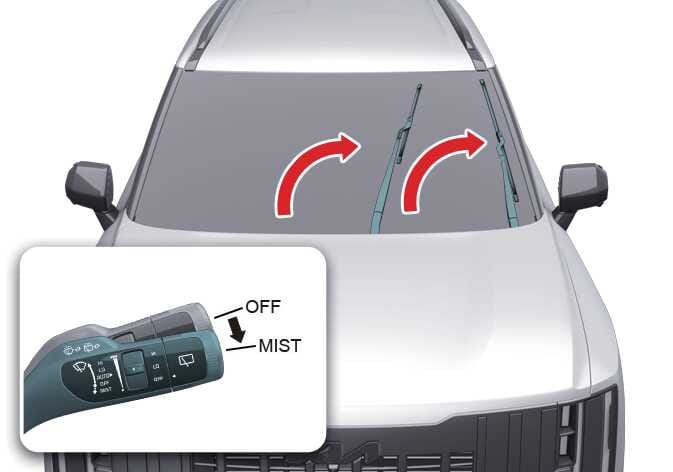 For your convenience, and to prevent hood paint damage, move the windshield wiper blades to the service position. After turning off the vehicle, move the wiper switch to the single wiping (MIST) position within 20 seconds. Hold the switch for more than 2 seconds until the wiper blades are pointing straight up.
