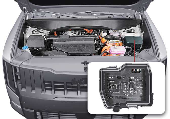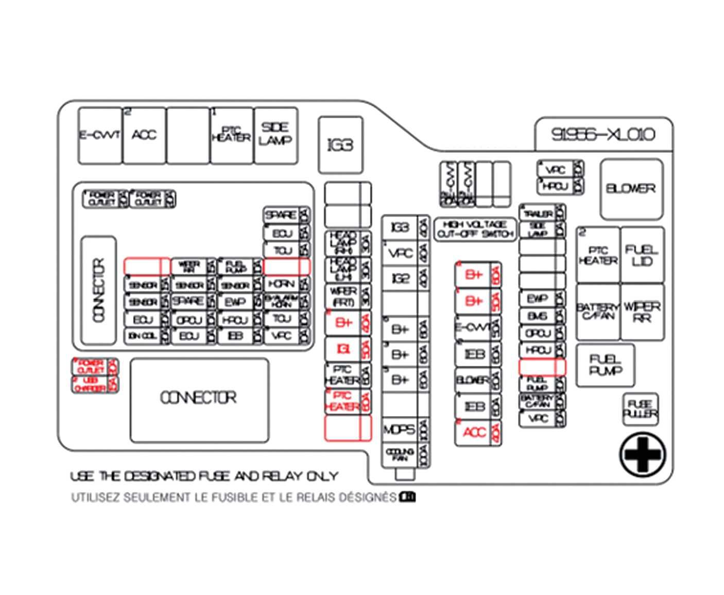 ER_JB (PCB_BLOCK) B+ FUSE LIST : IGN COIL, ECU1, INJECTOR (ICE), SENSOR1, SNESOR2, SENSOR3, SENSOR4 (HEV), FUEL PUMP2, A/C1 (ICE), ECU2, TCU1, HORN, B/ALARM HORN |
