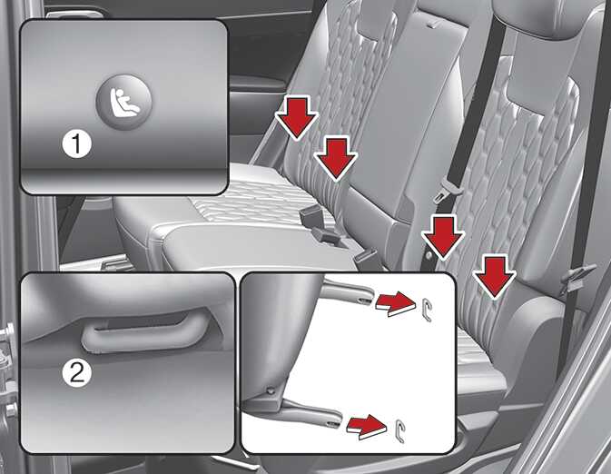 어린이 보조 좌석 심볼(1)이 뒷좌석 등받이 하단부에 위치하여 어린이 보조 좌석용 하부 부착구(2)의 위치를 나타냅니다.