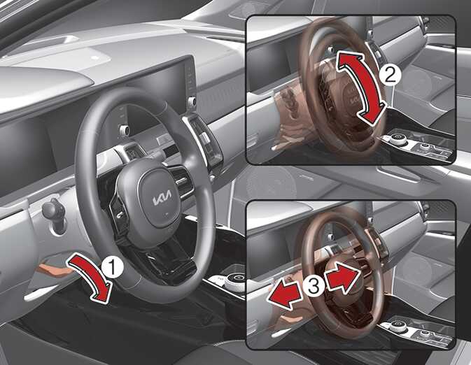 앞·뒤 조절을 할 때는 조절 레버를 아래로 당겨 내린 상태에서 스티어링 휠을 앞·뒤(3)로 조절하십시오. 조절 후 조절 레버는 위로 올려 원위치한 다음 스티어링 휠이 고정되었는지 확인하십시오. 반드시 운전 전에 조절하십시오.