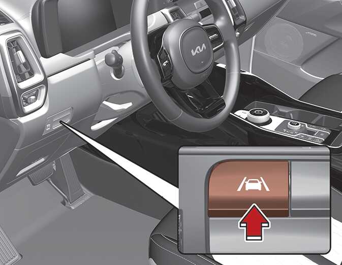 시동 「ON」 상태에서 차로 안전 버튼을 누르면 기능이 켜지고 계기판에 흰색 「