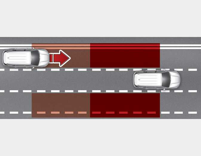 경고 영역은 자차의 속도에 따라 변경됩니다. 단, 사각 지대에 차량이 있더라도 자차가 빠른 속도로 추월할 경우 경고를 하지 않습니다.