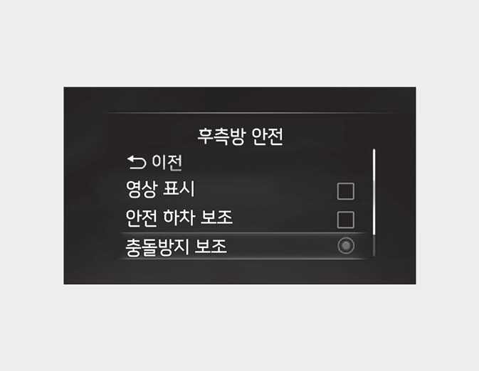시동 「ON」 상태에서 설정 메뉴의 「운전자 보조→후측방 안전」에서 세부 설정을 통해 각 기능의 사용 여부를 선택하실 수 있습니다.