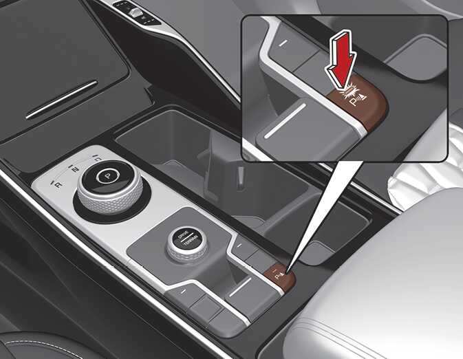 ) 버튼을 누르면 버튼 내 표시등이 켜지며, 전진 또는 후진할 때 작동합니다. 「R」단에서는 안전한 주차를 위해 작동 버튼을 눌러도 버튼 내 표시등이 꺼지지 않고 경고 기능이 작동합니다.