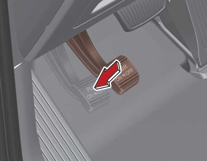 작동 해제 OMQ4070090L 주차 브레이크를 해제하려면 주차 브레이크 페달을 한 번 더 끝까지 밟은 다음 발을 떼어내십시오. 주차 브레이크를 해제하면 변속기의 위치에 따라 차량이 움직일 수도 있으므로 반드시 브레이크 페달을 밟은 상태에서 주차 브레이크를 해제하십시오. 출발하기 전에 주차 브레이크를 완전히 해제하고 계기판 내에 브레이크 경고등이 꺼졌는지 확인하십시오.