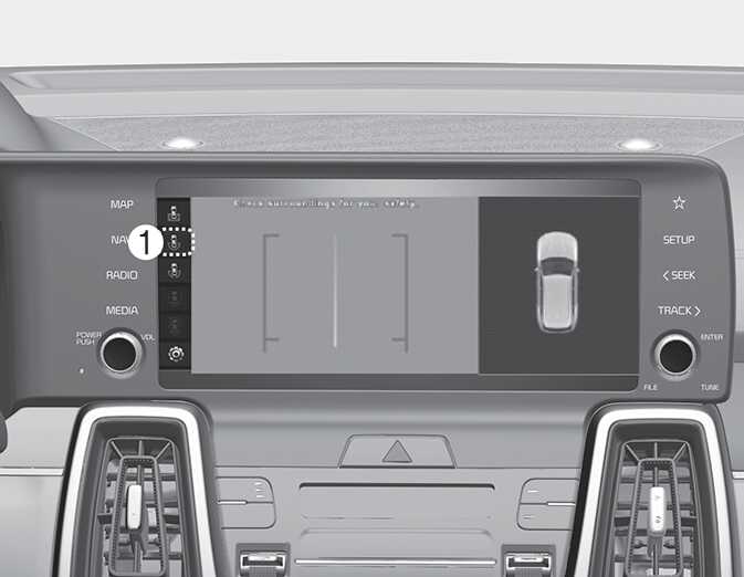 아이콘(1)을 터치하면 차량을 위에서 내려다 보는 영상이 화면에 표시되고, 주차할 때 후방 차량과의 거리를 보여주는 기능입니다.