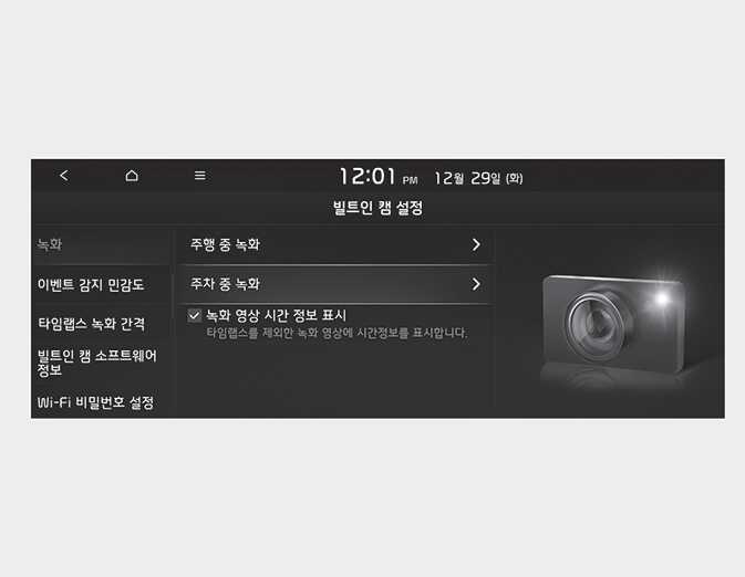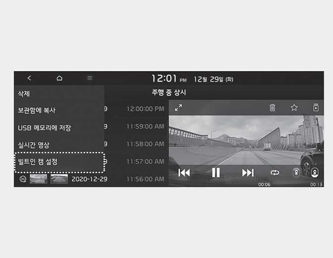 인포테인먼트 시스템 홈 화면에서 빌트인 캠을 선택한 후, 빌트인 캠 설정 → 녹화 → 주행 중 녹화 또는 주차 중 녹화를 차례로 선택하십시오. 주행 및 주차 시 녹화 방법을 선택할 수 있습니다.
