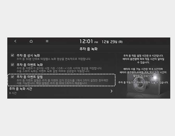 서비스를 사용하려면 인포테인먼트 시스템 홈 화면에서 빌트인 캠을 선택한 후 빌트인 캠 설정→녹화→주차 중 녹화→주차 중 이벤트 알림’을 선택하십시오.