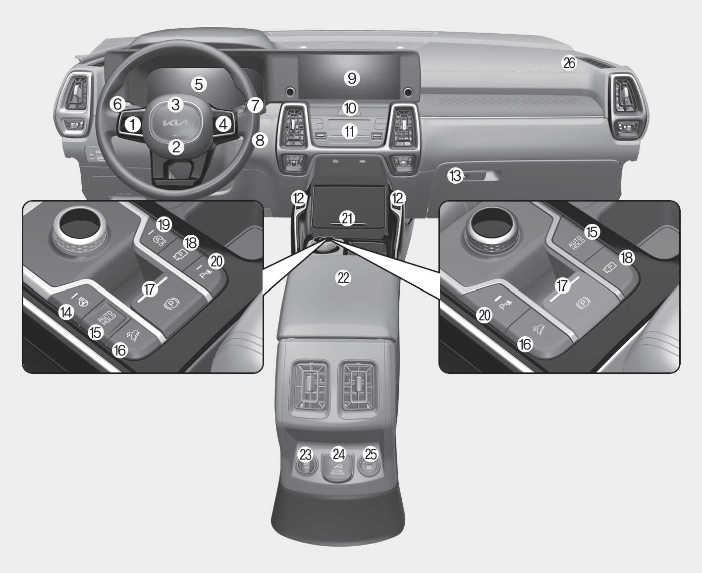 실제 차량과 다를 수 있습니다. (스위치의 형상 및 배열은 사양 적용에 따라 달라질 수 있습니다.)