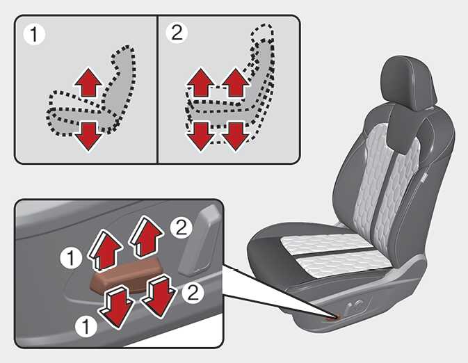 조절 스위치의 앞쪽(1)을 올리거나 내리면 좌석의 앞부분이 올라가거나 내려오고, 조절 스위치의 뒤쪽(2)을 올리거나 내리면 좌석 전체가 올라가거나 내려옵니다.