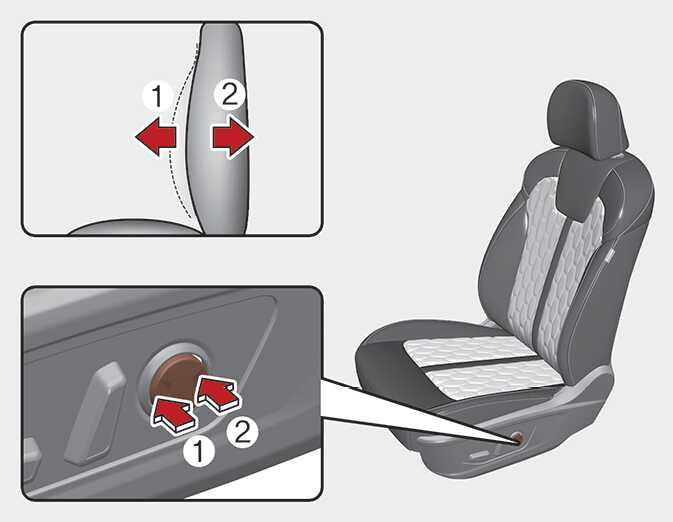 조절 스위치의 앞부분(1)을 누르면 등받이 허리 지지 부분이 앞으로 튀어나오고, 스위치의 뒷부분(2)을 누르면 허리 지지 부분이 뒤로 들어갑니다.