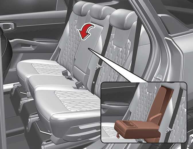 암레스트 조절(2열 좌석, 5인승 또는 7인승 차량) 암레스트 상단을 잡아당겨 내리십시오. 암레스트에 컵 홀더가 있습니다. 사용 후에는 위로 올려 원위치하십시오. OMQ4030033