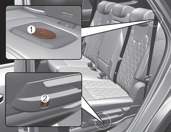 2열 좌석 등받이 상단의 스위치(1)를 누르거나 좌석 바깥쪽 하단에 위치한 스위치(2)를 눌러 잠금을 해제하십시오.