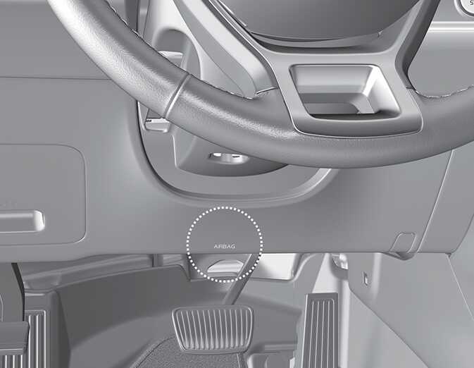 무릎 에어백은 스티어링 휠 아래 무릎 앞쪽 패드 안에 내장되어 있습니다.