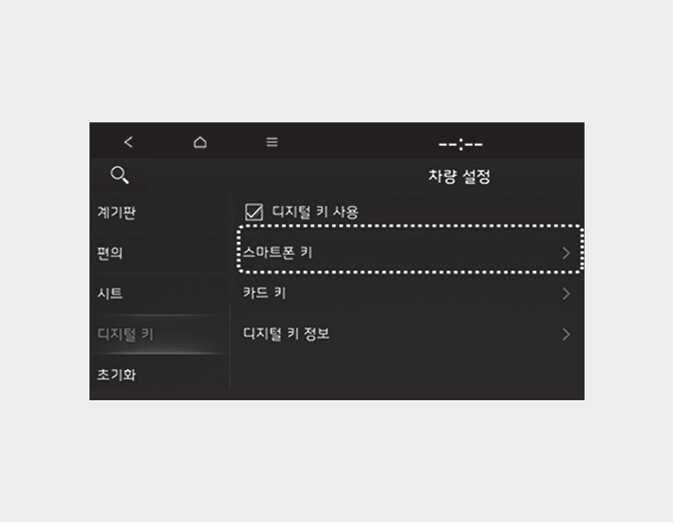 인포테인먼트 시스템 사양 미적용 시: 계기판 메뉴에서 '디지털 키→스마트폰 키'하위 메뉴로 이동하여 '등록'을 누르십시오.