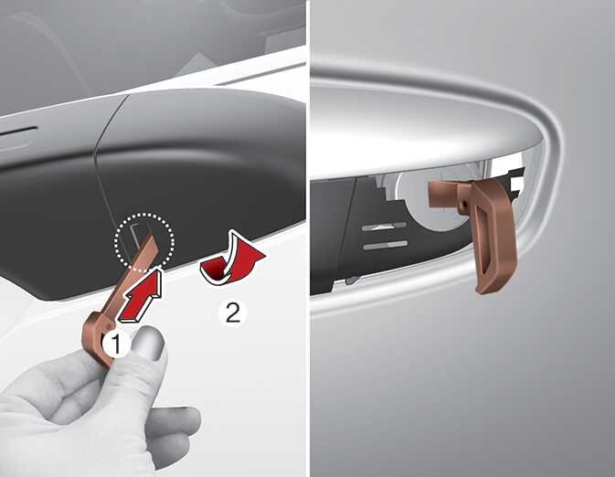 비상시 커버(2) 탈거 후 비상키(1)를 이용하여 운전석 도어를 잠그거나 열 수 있습니다.