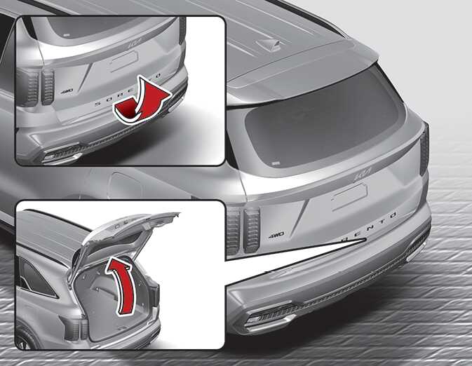 스마트키를 휴대하고 테일게이트 열림 버튼을 누르면 테일게이트의 잠금이 해제됩니다. 도어 잠금 상태에서도 작동 가능합니다.