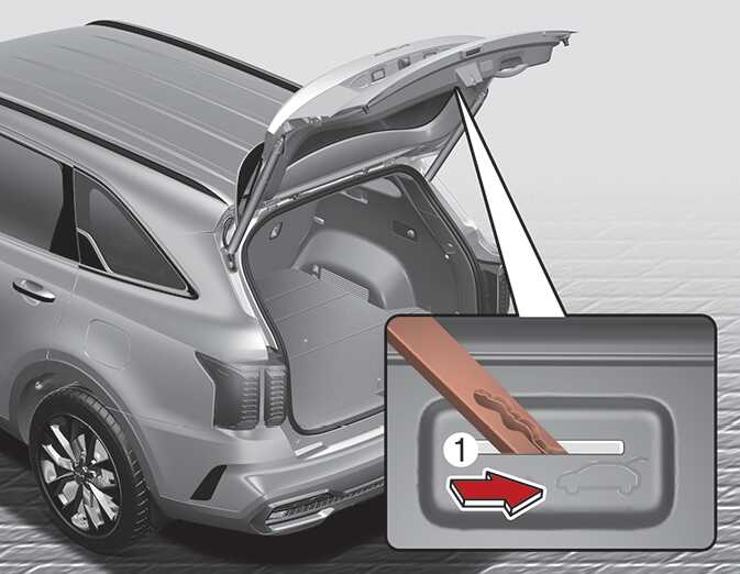 테일게이트 룸에 갇혔을 때 테일게이트에서 테일게이트 리드에 있는 흰색 레버 혹은 스틸 레버(사양 적용 시)를 화살표 방향(1)으로 밀면 테일게이트 잠금 장치를 해제할 수 있습니다.