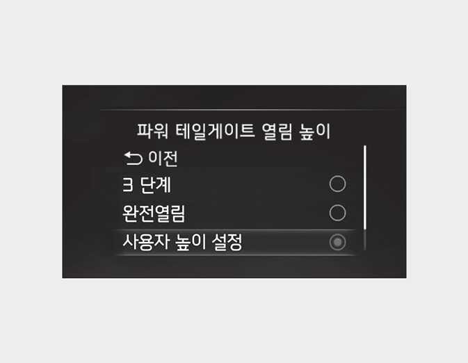 인포테인먼트 시스템의 설정 메뉴에서 도어→파워 테일게이트 열림 높이→1단계/2단계/3단계/완전열림/사용자 높이 설정'을 설정하면 파워 테일게이트 열림 높이를 설정할 수 있습니다.