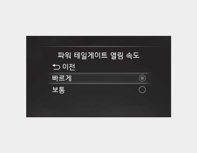 파워 테일게이트 기능이 꺼져 있을 경우 파워 테일게이트 열림/닫힘 속도 변경을 할 수 없습니다.