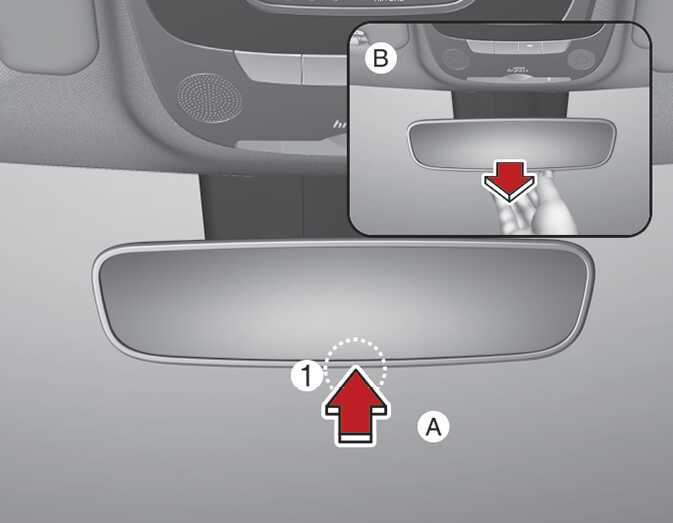 야간 주행 시 주·야 변환 레버(1)를 운전자 방향으로 당기면 뒤차의 전조등 불빛으로 인한 눈부심을 줄일 수 있습니다.