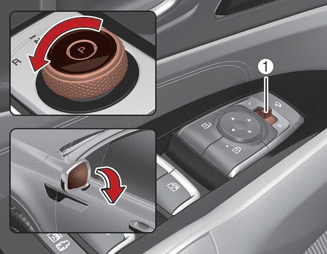 실외 미러 조절 선택 스위치(1)의 위치에 따라 기능이 설정 또는 해제됩니다.