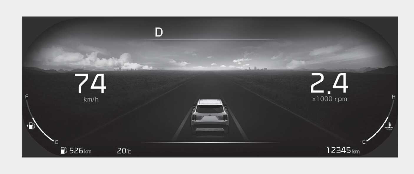 테마C는 Full LCD 타입 계기판의 사용자 설정 테마로 아날로그 형태의 계기판을 디지털화 해서 보여주며 날씨, 시간에 따라 배경 화면이 변화합니다.
