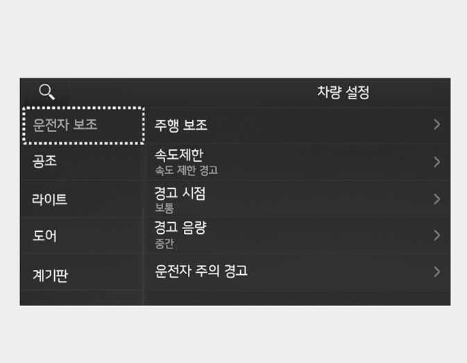 Full LCD 타입의 인포테인먼트 시스템에서 주행 보조 기능을 설정할 수 있습니다. 인포테인먼트 시스템 화면 내에 차량 설정 메뉴를 선택한 후에 해당 항목들을 설정하십시오.