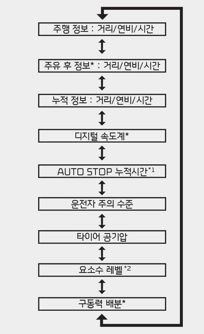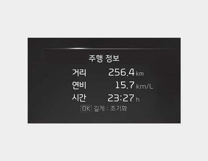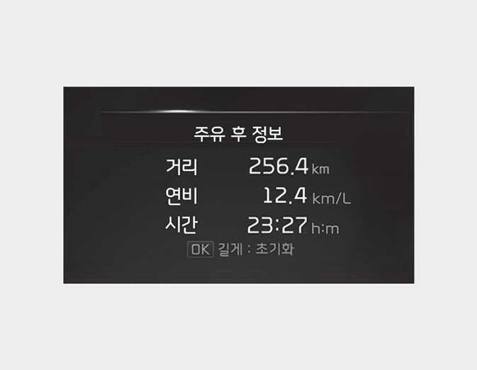 주유 후 연비(주유할 때마다): 연료를 주입하거나 주유 후 연비가 표시된 상태에서 「OK」 버튼을 약 1초 이상 누르면 초기화됩니다.