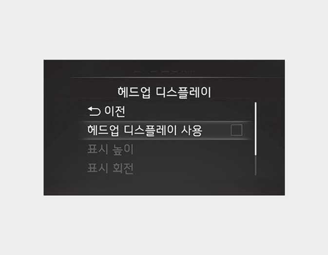 시동 「ON」 상태에서 계기판 또는 인포테인먼트 시스템(사양 적용 시)의 사용자 설정 메뉴에서 「사용자 설정→헤드업 디스플레이」 에서 기능을 설정/해제 할 수 있습니다.
