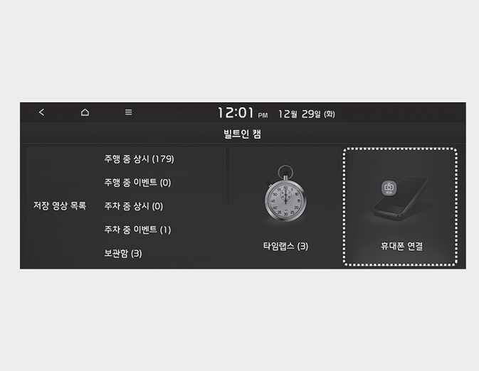 인포테인먼트 시스템 홈 화면에서 빌트인 캠 선택 후, 휴대폰 연결을 선택하여 스마트폰 연결이 가능한 상태로 만드십시오.