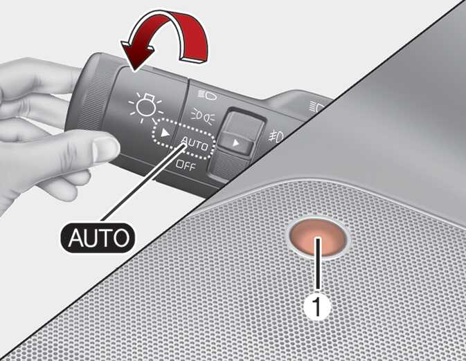 시동 「ON」 또는 시동 상태에서 조명스위치를 「AUTO」 위치로 선택하면 센서(1)가 외부 밝기(조도)를 감지하여 조명을 켜거나 끕니다.