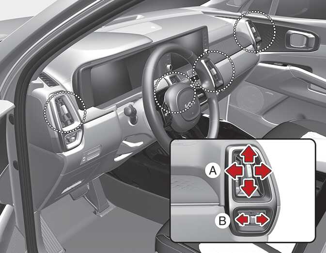 방향 조절 레버를 상/하 조절 시 상측 송풍구(A)와 하측 송풍구(B)의 바람 방향이 동시에 상/하 조절 됩니다.