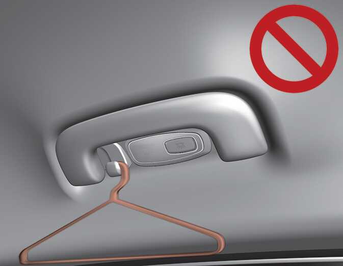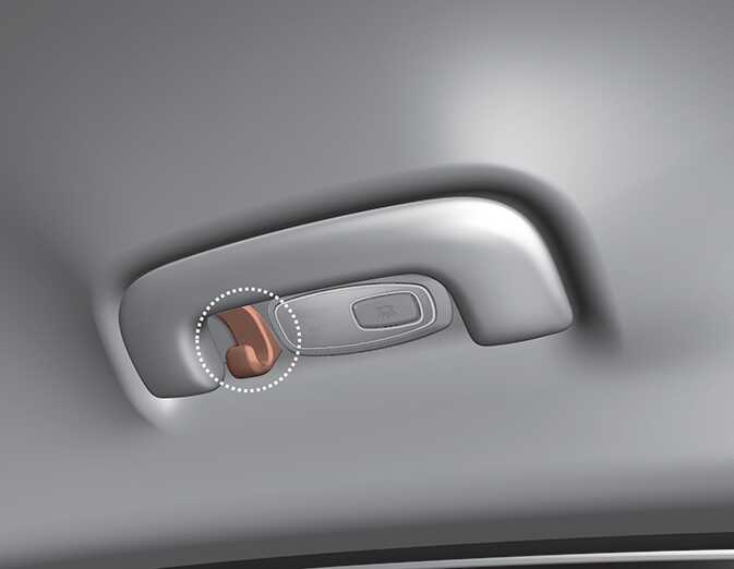 코트 후크에는 옷 이외의 다른 물건(옷걸이 및 단단하거나 날카롭거나 깨지기 쉬운 물건 등)은 걸지 마십시오. 충돌 및 커튼 에어백 전개 시 이 물건들은 발사체가 되어 차량 손상뿐만 아니라 탑승자의 부상이나 사망을 초래할 수 있습니다.