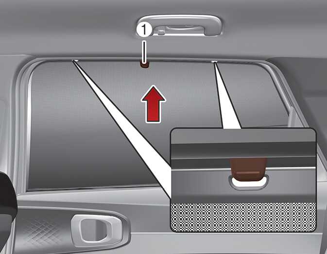 뒷좌석 도어 매뉴얼 커튼 (사양 적용시) OMQ4040421 뒷좌석 유리를 통해 들어오는 외부 광선을 차단하고자 할 때 다음과 같이 사용하십시오. 커튼 고리(1)를 잡고 올리십시오. 장착된 양쪽 후크에 커튼을 거십시오.