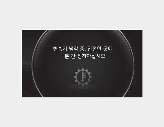 이러한 상황이 발생되면 안전한 곳으로 이동 후 시동 버튼 「ON」 상태에서 「P」(주차)로 변속하고 화면의 경고문구가 사라질 때 까지 수 분 동안 정차하십시오.