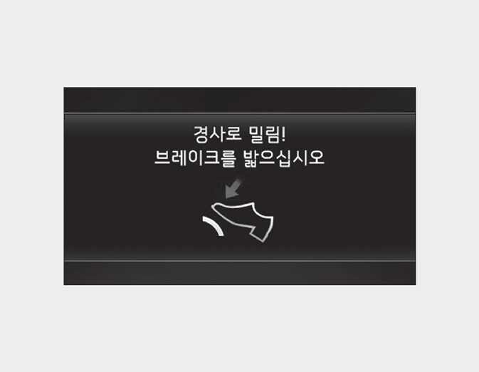 이 경우 LCD 경고창에 경고 메시지가 나타나며, 지시에 따라 브레이크 페달을 밟으십시오.