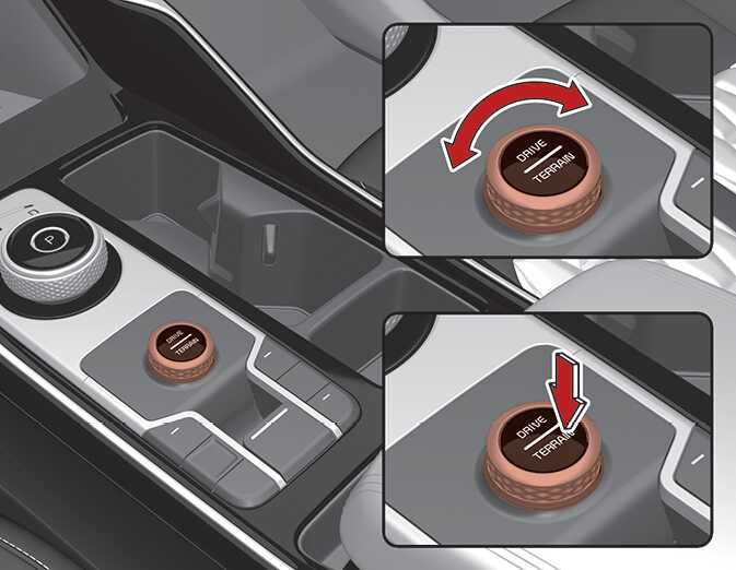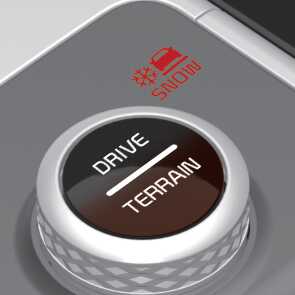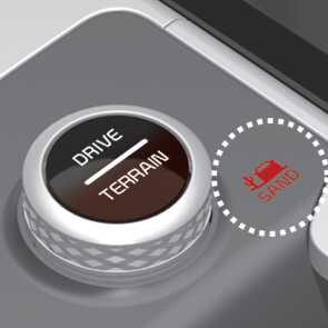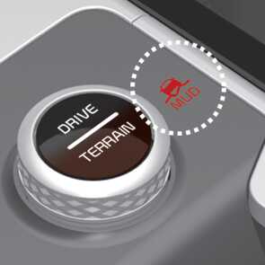 「DRIVE/TERRAIN」 모드 버튼을 누르면 드라이브 모드에서 험로 주행 모드(Terrain Mode)로 변경이 됩니다. 4초 이내에 험로 주행 모드(Terrain Mode) 노브를 회전하여 SNOW/MUD/SAND 모드를 선택할 수 있습니다. 다시 「DRIVE/TERRAIN」 모드 버튼을 누르면 기존 선택된 드라이브 모드로 변경이 됩니다.