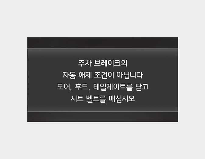 운전자가 안전벨트 미착용 상태이거나 운전석 도어가 열린 상태, 후드가 열린 상태 또는 테일게이트가 열린 상태에서 시스템 작동 조건 불만족으로 자동 해제가 안 될 때, LCD 표시 창에 경고메시지가 뜨고 경고음이 1회 울립니다.