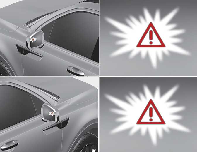 실외 미러와 헤드업 디스플레이(사양 적용 시)에 경고등이 표시되어 운전자에게 알립니다.