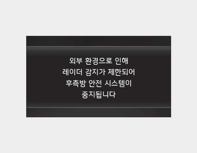 인식 센서 경고 메시지가 표시되지 않거나 경고등이 켜지지 않더라도 후측방 안전 기능이 정상 작동하지 않을 수 있습니다.