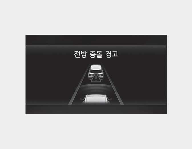 스마트 크루즈 컨트롤이 작동하는 상태에서 전방 차량과의 충돌 위험이 높을 경우 계기판에 경고 메시지가 표시되고, 경고음이 울려 전방 충돌 경고를 운전자에게 알립니다. 즉시 전방 도로 상황 및 주행 상태를 확인하고 필요하면 브레이크 페달을 밟아 직접 속도를 조절하십시오.