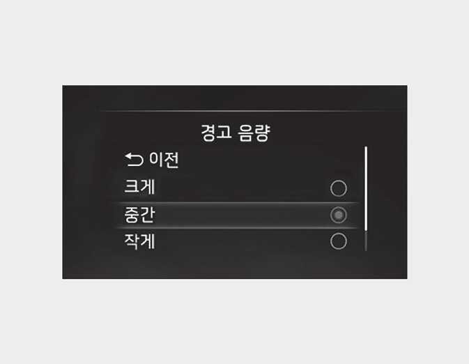 경고 음량 설정을 변경하면 차내 다른 기능의 경고 음량도 같이 변경될 수 있습니다. 경고 음량에 대해 충분히 확인한 후에 변경하십시오.