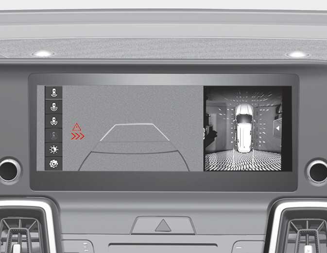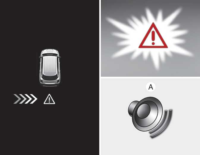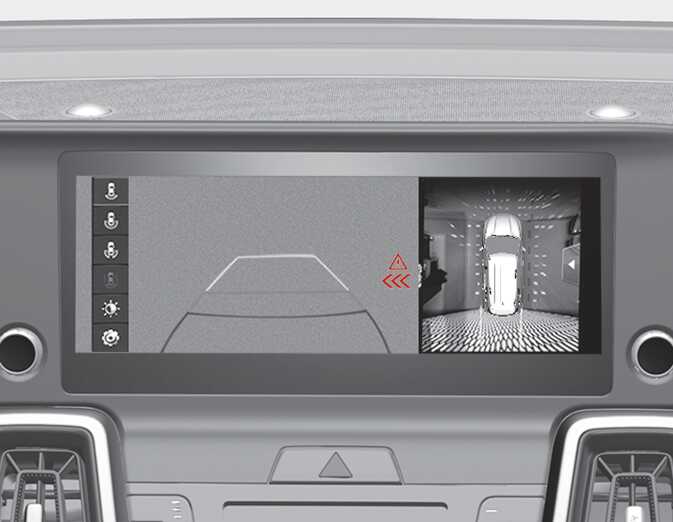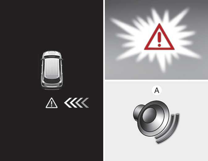 실외 미러 경고등이 깜빡이고 계기판에 경고 메시지가 표시됩니다. 동시에 경고음이 울리며, 후방 교차 충돌 경고를 운전자에게 알립니다. 인포테인먼트 시스템 화면(사양 적용 시)의 후방 영상에도 경고가 표시됩니다.