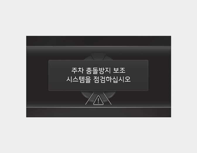 후방 주차 충돌방지 보조 또는 연관 기능에 이상이 있으면 경고 메시지를 표시하고 기능이 자동으로 해제됩니다. 자사 직영 서비스센터나 서비스협력사에서 기능 점검을 받으십시오.