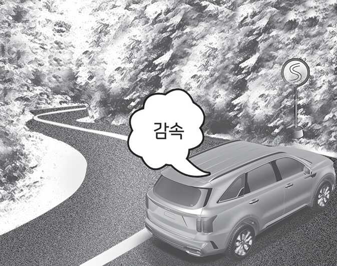 커브 길을 주행할 때는 브레이크를 밟거나 기어를 변속하지 말고, 미리 속도를 줄인 후, 가능한 한 차체를 똑바로 유지하면서 도십시오.