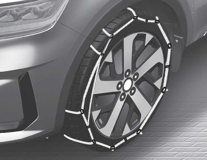 체인을 장착한 후에는 천천히 운행하십시오. 체인이 차체나 섀시에 닿는 소리가 들리면 즉시 차를 멈추고 체인을 조이십시오. 소리가 나지 않을 때까지 감속하고 눈이 없는 도로 주행 시에는 바로 체인을 풀어 체인이 손상되지 않도록 주의하십시오.