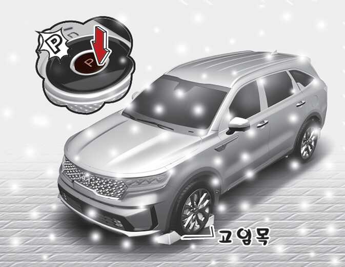 매우 추운 날씨의 주·정차 시 주차 브레이크를 작동해 놓으면 브레이크 장치가 얼어 붙어버릴 우려가 있으므로 주차 브레이크는 가능한 풀어 놓은 상태에서 주차하십시오. 경사없는 평지에 변속 위치를 「P」(주차) 위치로 타이어에는 고임목을 받쳐 차가 움직이지 않도록 하십시오.