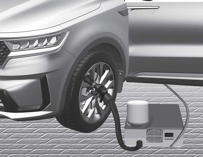 실런트(봉합제) 주입을 위해 컴프레서 전원 스위치를 눌러 약 5~7분 정도 작동하여 적정 타이어 공기압( 타이어 및 휠 참고)이 되도록 실런트(봉합제)를 주입하십시오. 타이어 공기압은 나중에 다시 확인 및 재조정하십시오.